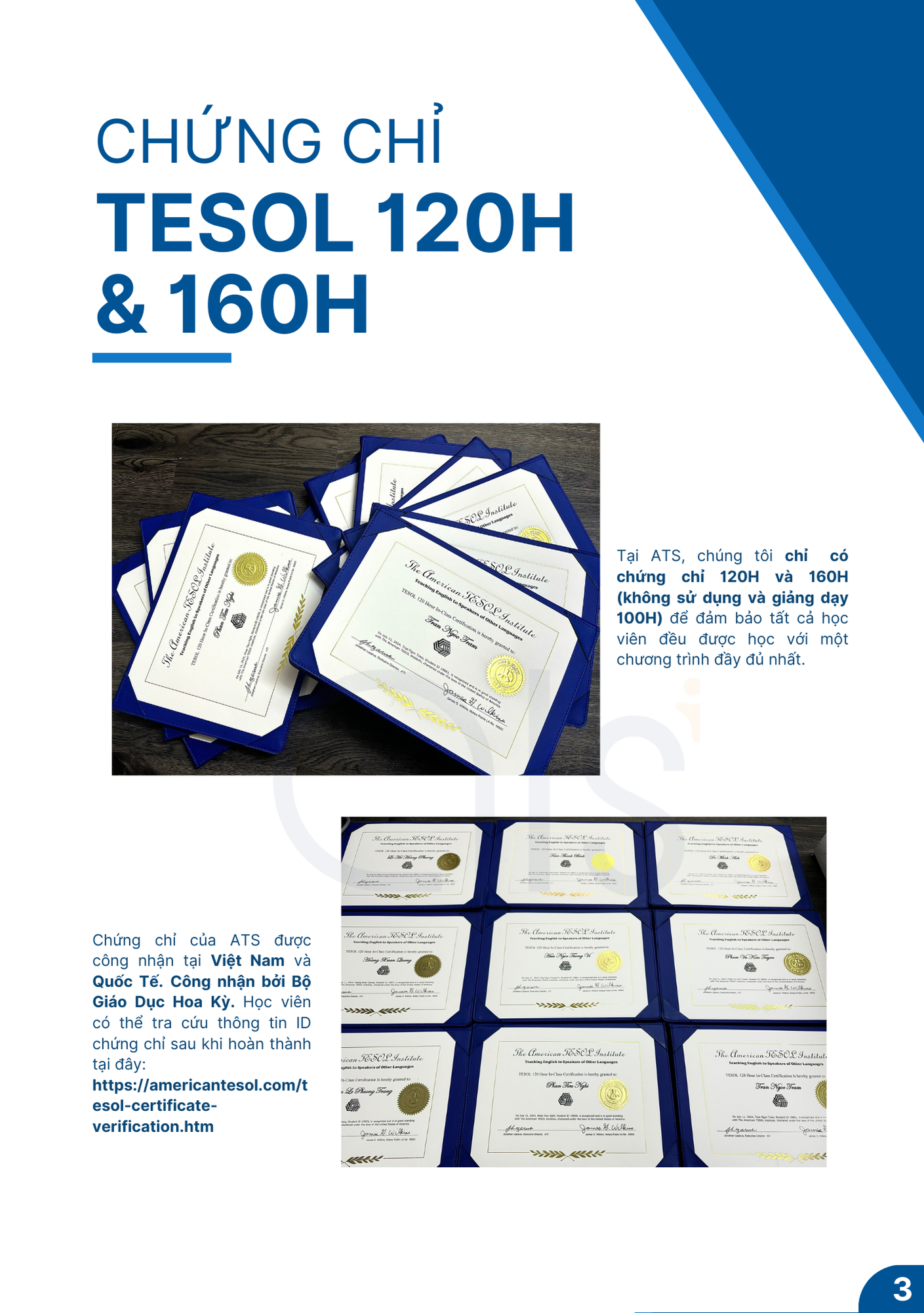 Vì là đối tác độc quyền nên ATS được toàn quyền phát triển các khóa TESOL với học phí thấp nhất là 6.000.000 trong đó có thể kể đến như TESOL 120H (Online, Offline, Premium 1:1 và cả E-learning, điều mà khá ít trung tâm có thể làm được). Chứng chỉ TESOL 160H là sản phẩm mới với các nội dung giảng dạy chuyên sâu hơn như Tâm lý học giáo dục, Giảng dạy trẻ em có nhu cầu đặc biệt dự kiến sẽ là 1 chứng chỉ mới triển vọng trong tương lai.
