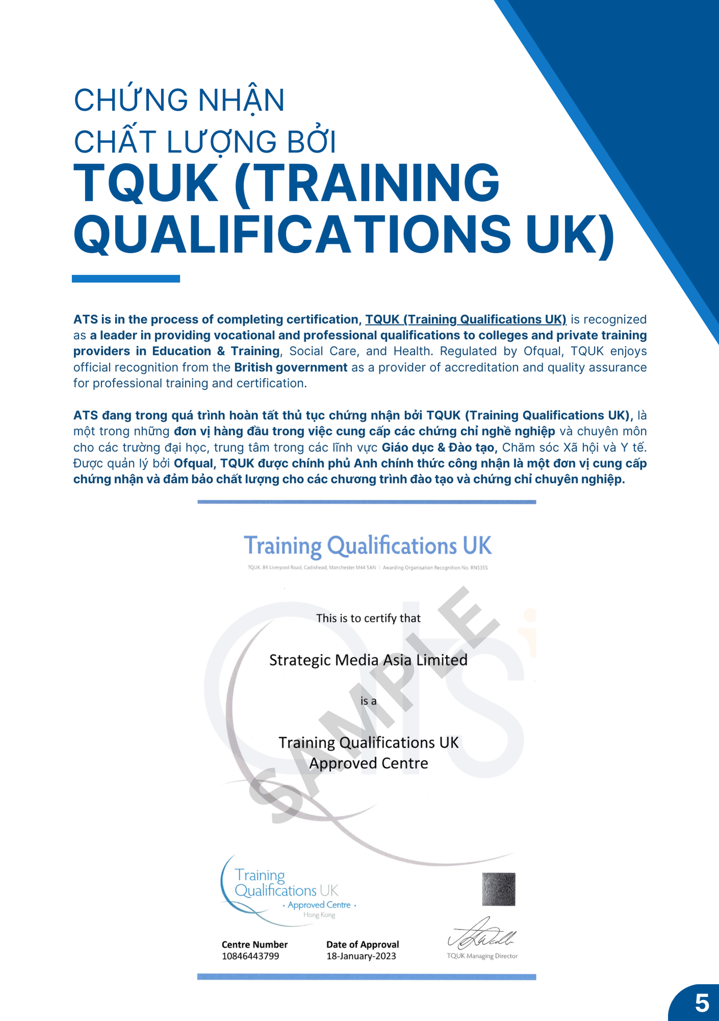 TQUK là viết tắt của Training Qualifications UK, một tổ chức chứng nhận (Awarding Organisation) được chính thức công nhận bởi Ofqual – Cơ quan điều hành các bằng cấp và kiểm định chất lượng của chính phủ Anh. Ofqual chịu trách nhiệm đảm bảo rằng tất cả các bằng cấp được cấp tại Anh đều tuân thủ các tiêu chuẩn giáo dục và chất lượng cao.